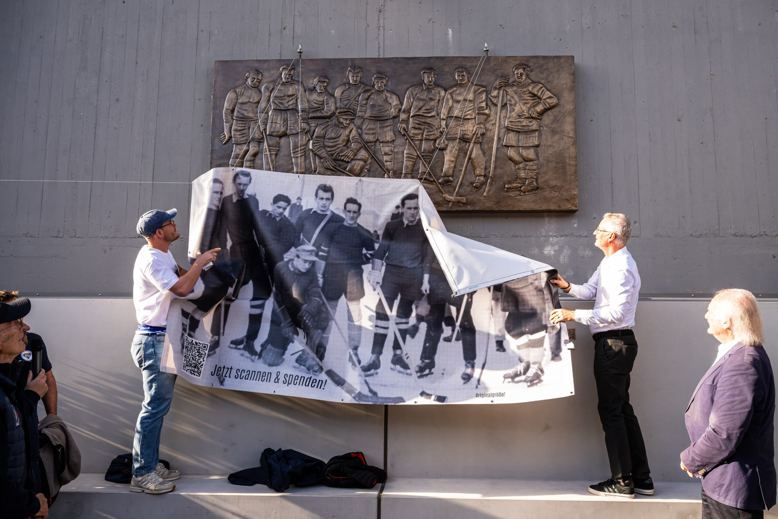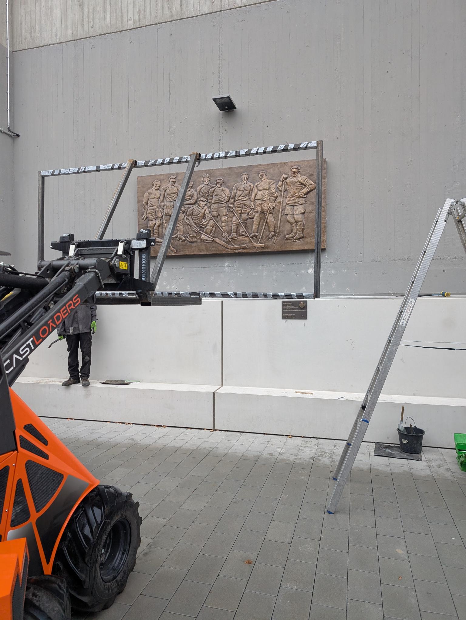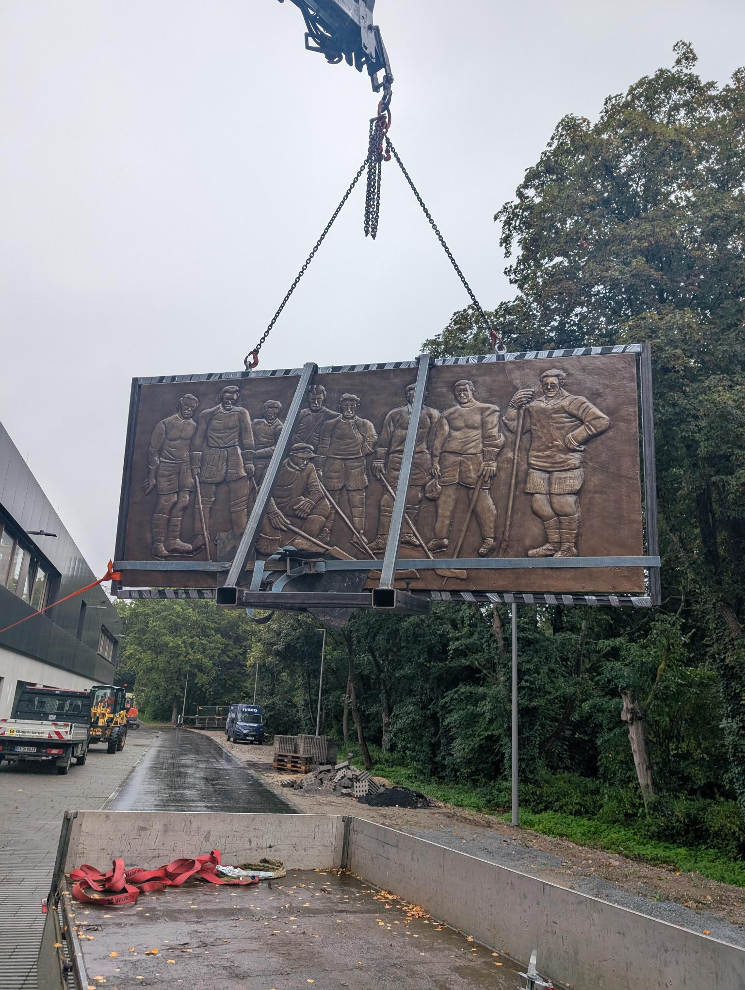 3 Meter breit, 1,30 Meter hoch und knapp 400 Kilogramm schwer blickt das Bronzerelief künftig auf das Straubinger Eishockey und seinen Weg vom zugefrorenen Eisweiher bis in die Stadien Europas.