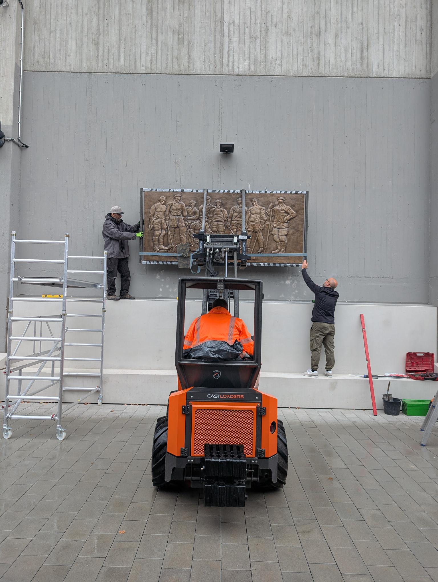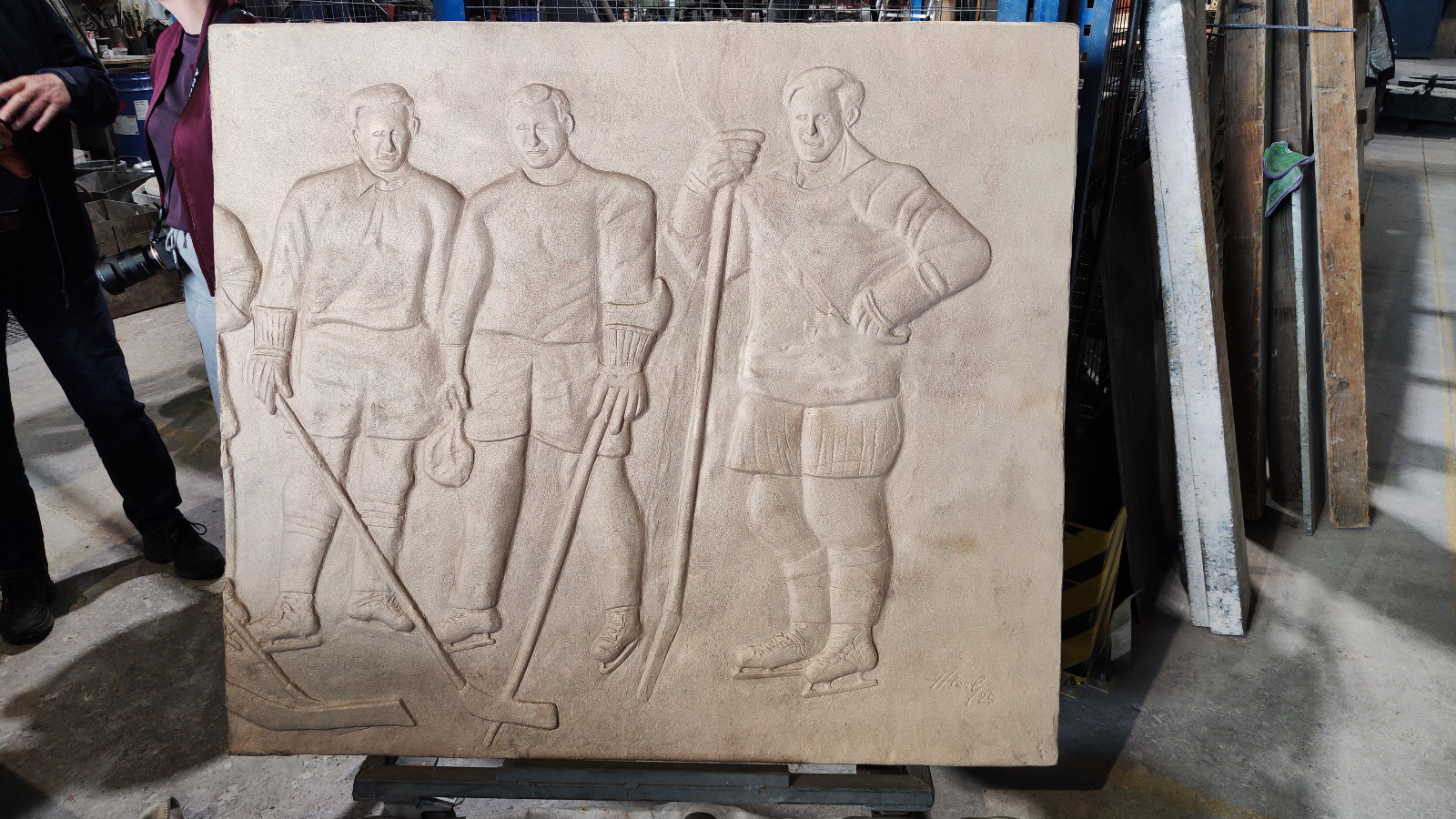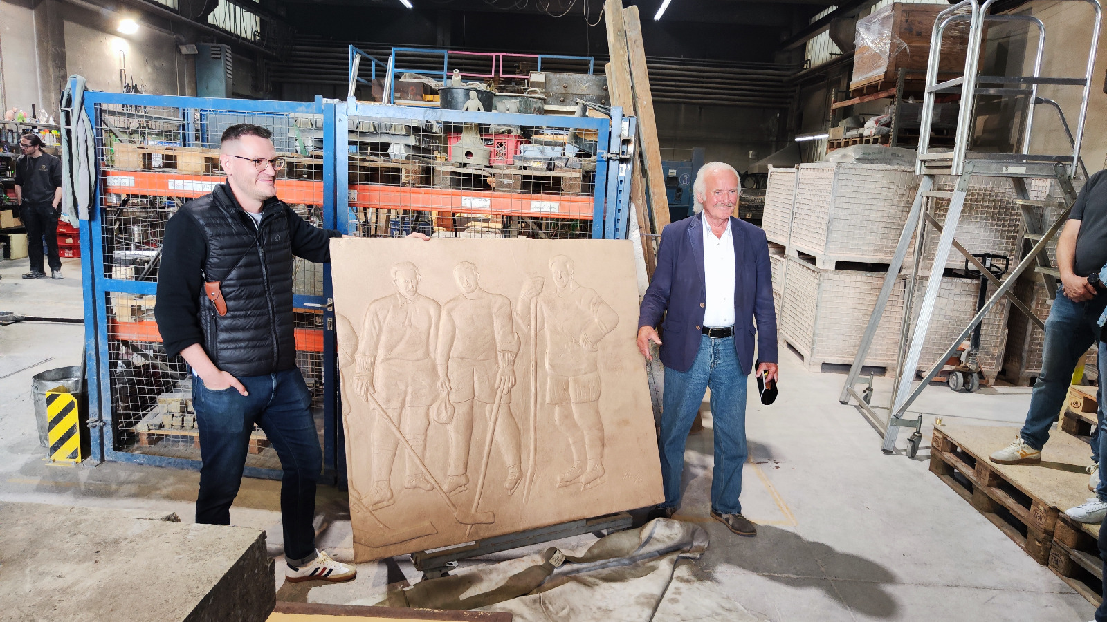 3 Meter breit, 1,30 Meter hoch und knapp 400 Kilogramm schwer blickt das Bronzerelief künftig auf das Straubinger Eishockey und seinen Weg vom zugefrorenen Eisweiher bis in die Stadien Europas.